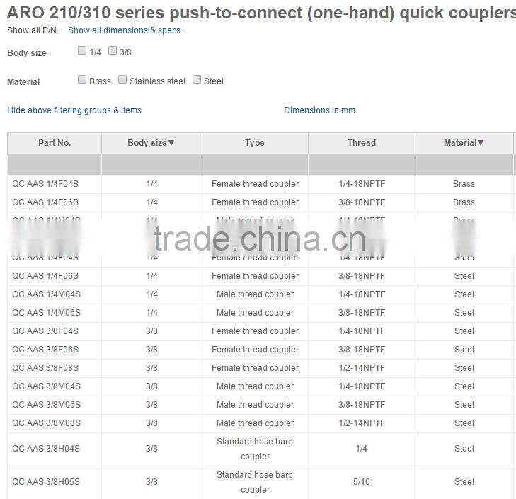 Pneumatic quick release couplings - ARO 210 /310 series push-to-connect,ARO 210/310 series push-to-connect (one-hand) quick couplers.
