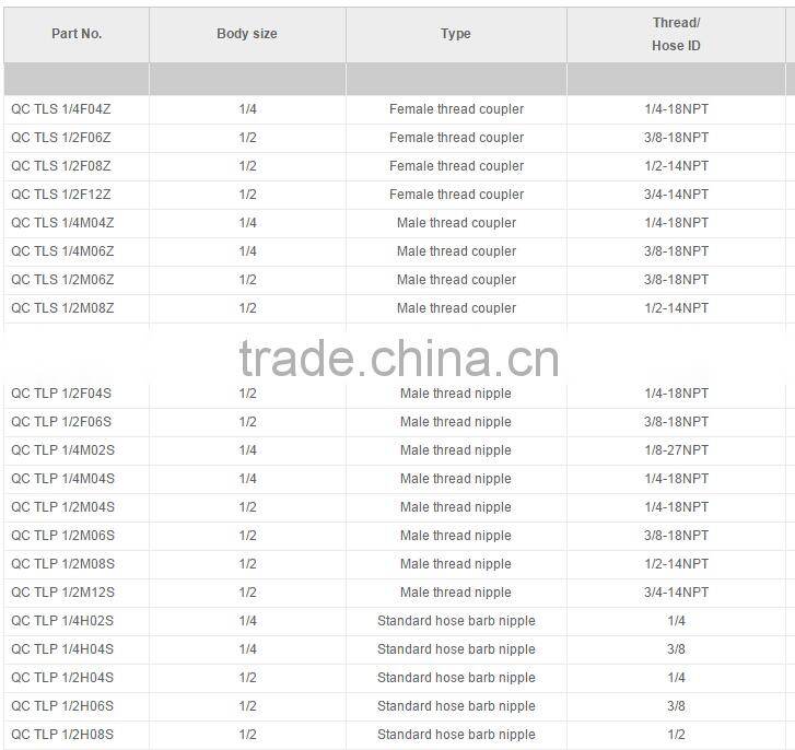 Pneumatic quick release coupling, Schrader Twist-Lock, male female coupling, Schrader Twist-Lock series push-to-connect (one-hand), zinc body couplers with steel sleeves, steel nipples.