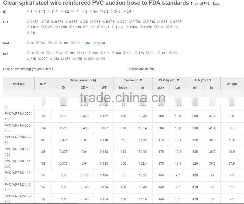 - PVC-WRF Spiral steel food suction imperial Clear spiral steel wire reinforced PVC suction hose to FDA standards
