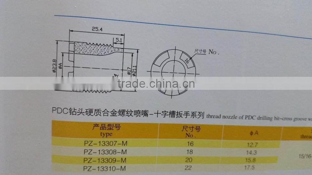 The cemented carbide nozzles will be used mainly to PDC drill bits and cone roller bits for flushing, cooling and lubricating drill bit tips and cleaning stone chips in the well bottom with drilling liquid in the working conditions of high pressure ,vibration,sand and slurry impacting during oil and natural gas prospecting.