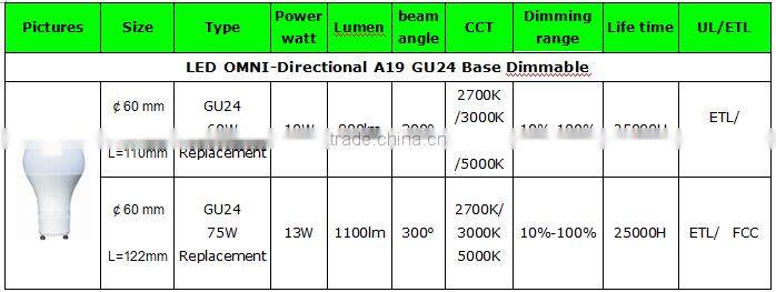Home > Products > A19 BR PAR Series > Dimmable Omni-Directional 300 Beam 800LM/1100LM ETL Listed GU24 LED Bulb