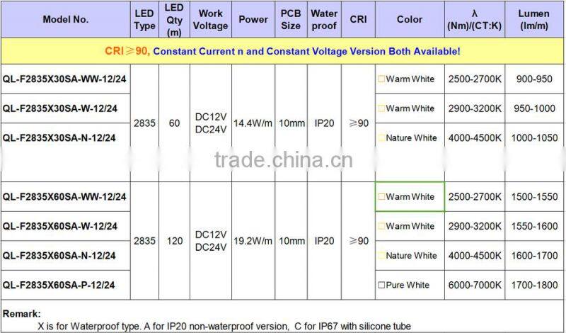 | Specifications of CRI≥90 2835 LED Strips: |