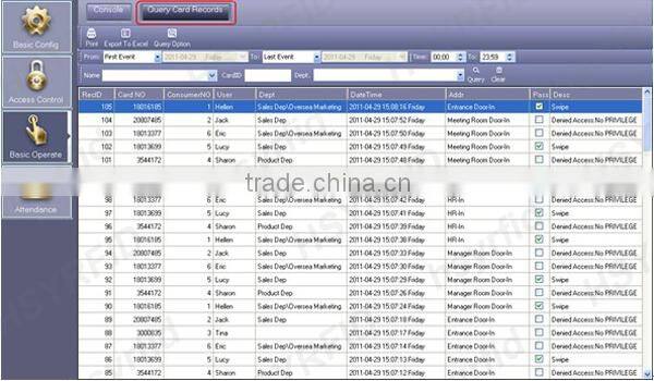 Access Software provides numerous access control and alarm monitoring features: expiry date for clubs, automatic activation, time zones, supervision, anti-passback, activity reports... Each alarm input is programmable: operating mode (NO or NC), time zones, local reflex (activation of outputs according to input status). Specific alarms are triggered according to the number of unsuccessful attempts, the time limit for door closing (door alarm), the duress code...Whenever required, the data stored in the controllers is transferred to the computer and activity reports are printed. Each controller works independently and keeps its own database.