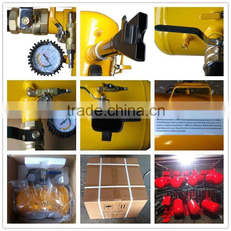 Pneumatic portable air bead seater capacity 36L Super strength fast blasting. Ideal for various tubeless tyres Valve switch design makes convenient operation. Users only need to push the bottom. Anti-rust powder coating Pressure meter exactly display the pressure in tank Pressure relief valve procection for tank pressure To empty the air from the pump when move the pump or nonuse. The operator is suggested to wear ear protector and protection eyeglass when operation |