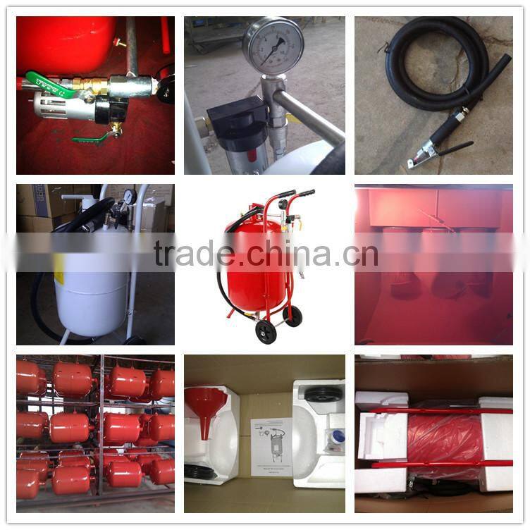 Portable sand capacity sand blaster with heavy duty all steel construction. Ideal for removing rust and blot before welding and painting in industy, automotive repair and household application Pressure gauge exactly display the working pressure. sanding media: aluminum oxide, glass beads and so on. 3/8" x 2.5m high pressure rubber hose. sandblast gun with ceramic nozzle size: 2.4/2.7/3.2/3.6MM Air filter with pressure meter. Brass release valve protection for the pressure in the tank. Accessory: pvc filling funnel, canvas helmet. |