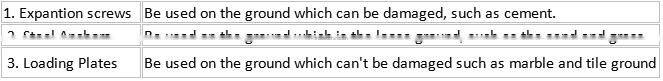 Fixing Methods: ground anchors, weight plate, expandable bolts