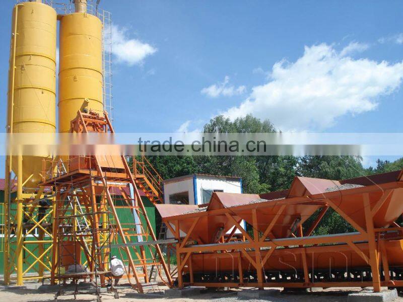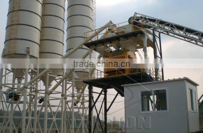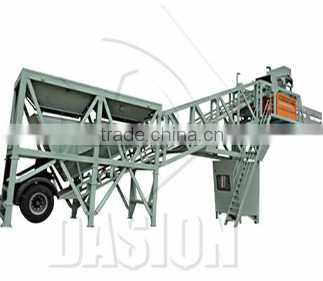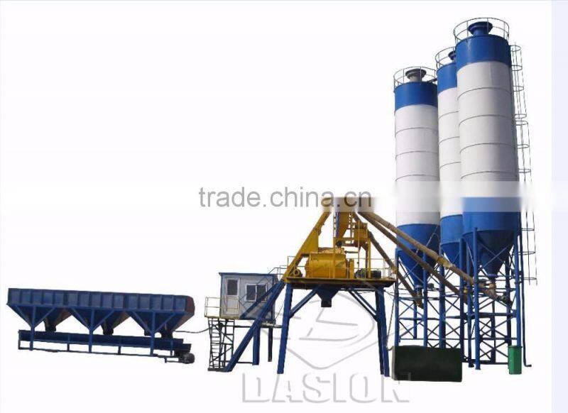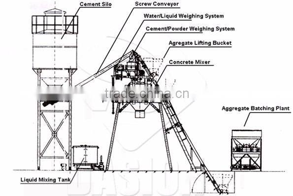 DASION Bucket type of concrete mixing plant consists of material batching, mixing and electric control system, etc, which is professional equipment for ready mix concrete production, such as plasticity/dry concrete. DASION concrete mixing plant is widely used in small and medium construction products, road, bridge project, and concrete prefabrication factory.