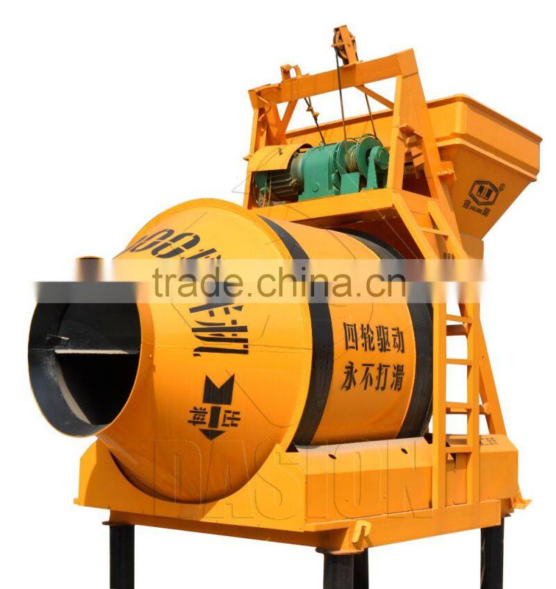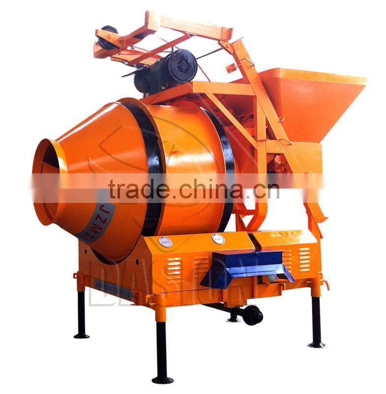 JZM series concrete mixers are self falling type bipyramid reversed discharge concrete mixing machine. The mixing drum is driven by friction between rubber pad and riding wheel. In working style, clockwise rotating for concrete mixing, and anti-clockwise rotating for concrete discharging.