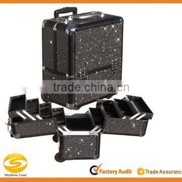 black rolling travel cosmetic organizer makeup artist train case, black Aluminum train makeup case with rehinstone, rolling aluminum hard shell cosmetic bag train case