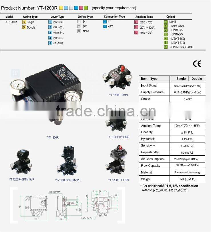 The Pneumatic Pneumatic Positioner YT-1200 series are used for pneumatic valve actuators by means of pneumatic controller or control systems with an output signal of 3 to 5 psi or split ranges.