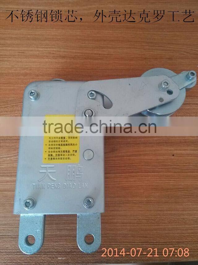 When the steel wire rope is broken ,blocked ,slip out of he hoist or the working platform inclines,the safey lock will lock the rope within 100mm, this safety device is high advanced in China now .