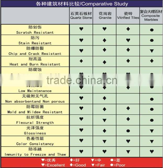Apart from being second hardest material to diamond, it's not only scratch proof but also non-porous and stain resistant. Quartz easily overcomes all the shortcomings of vitrified tiles and composite marbles besides providing exquisite array of color and pattern consistency.