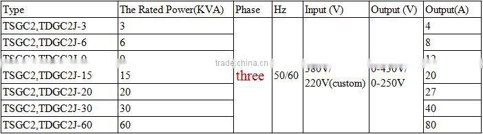 reliable, etc. Widely used in industry (as chemical industry, metallurgy industry, apparatus & meter, mechanical and electrical equipment industry, and light industry), scientific experiment, public equipment and household electrical appliance to voltage regulate, temperature control, light change and power control. It is an ideal AC voltage power supply.