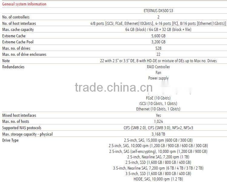 applications and business analytics / big data – all into one system. It provides ample headroom for demanding server / desktop virtualization environments and enterprise file services. Extensive high-availability and disaster recovery capabilities make ETERNUS DX500 S3 an ideal storage system for businesscritical data.