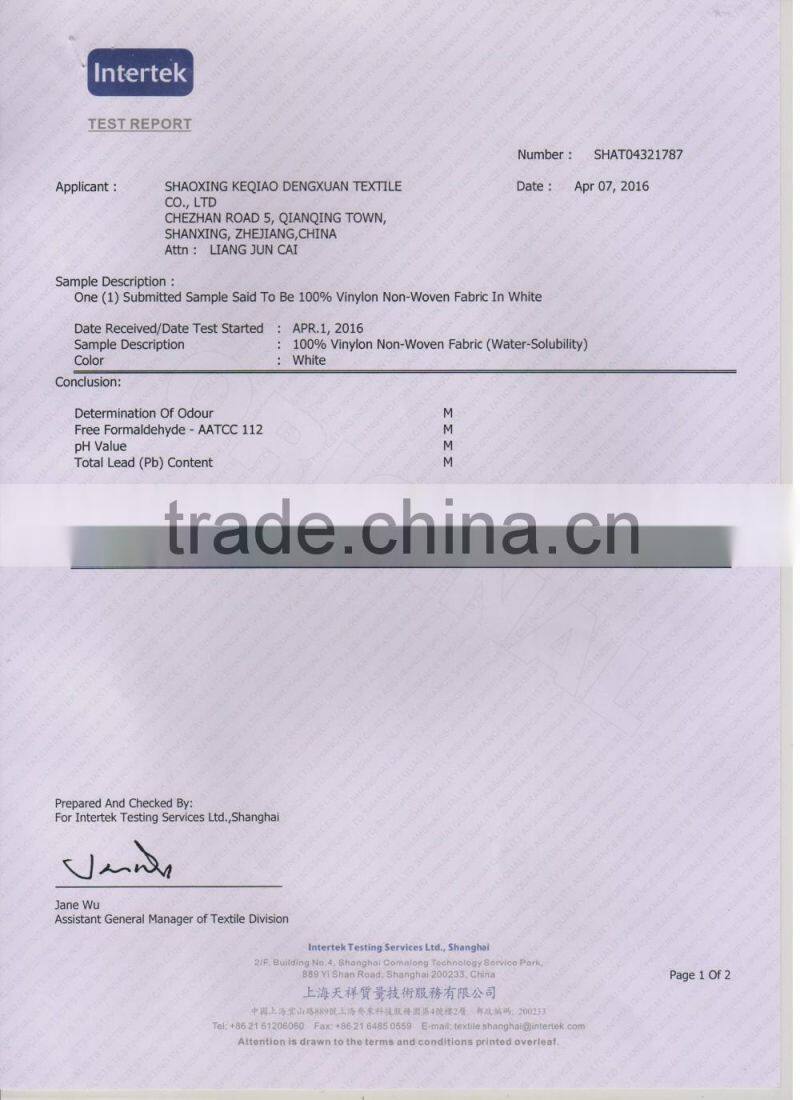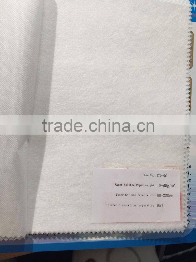 It mainly used as embroidery lining fabric.Water soluble paper is made of Polyvinyl alcohol fiber(PVA).Compleltely soluble in water at different temperature 20℃ to 100℃.After the dissolution of water soluble paper,it is non-toxic,colorless,,tasteless,odorless and zero pollution.
