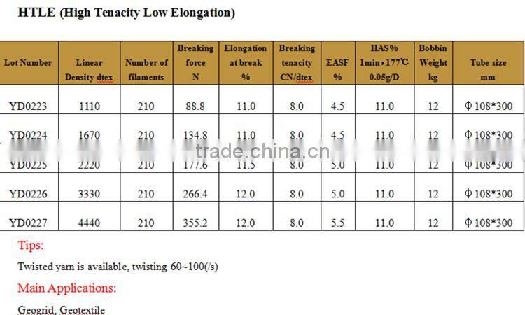 Eco-Friendly High Tenacity Low Elongation Polyester Yarn has high breaking tenacity, low elongation at break,so this polyester yarn are used in Geogrid, Geotextile.