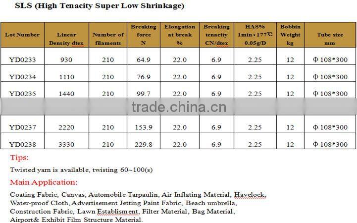 The fire retardant High Tenacity super low shrinkage dyed filament Yarn are used in Coating Fabric, Canvas, Automobile Tarpaulin, Air Inflating Mavelock, Water-proof Cloth, Advertisement Jetting Paint Fabric, Beach umbrella,Construction Fabric, Filter Fabric, Bag Material, Airport&Exhibit Film structure material.