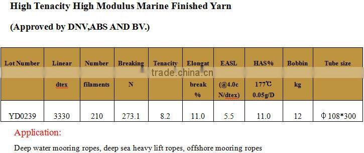 fire retardant high tenacity High modulus polyester fdy Yarn can be used in Deep water mooring ropes, deep sea heavy lift ropes, offshore mooring ropes.