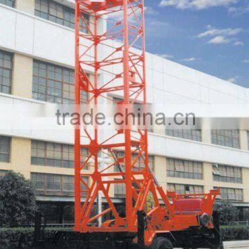This drilling machine is driven by hydraulic pressure, being double layer chassis type. The upper chassis can move back and forth on the lower one; the drilling tools in the sphere that has the diameter with 2m can be put into the well bore without the movement of the lower chassis. Therefore, the drilling machine is convenient and reliable, which can guarantee the construction quality. According to the situation of construction site and custome of construction unit, the displacement of lower chassis can be selectes among the three forms (i.e. prise, steel, wheel and rolling bar) at will to meet the need of construction.