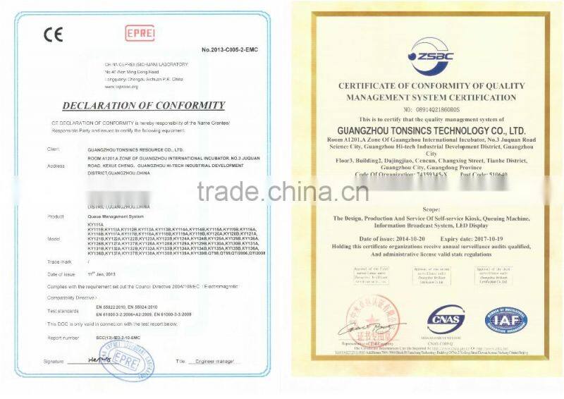 Guangzhou Tonsincs Technology Co.,Ltd is a leading manufacturer of Queue management system.Custom feedback system,Touch information kiosk ,Self-service kiosk,LEDdisplay and information broadcast system for over 11years.with factory based in Guangzhou .Our all products have according to CCC,CE ISO9000 Cerficate.OEM/ODM services are also available.