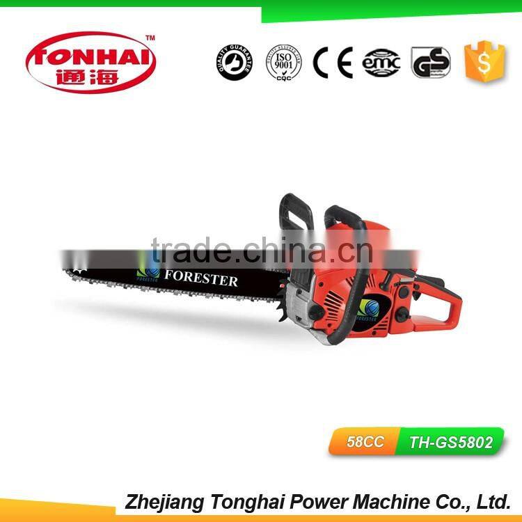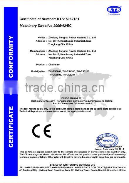 Tonghai Chainsaw (TH--GS4200) is mainly designed for home & semi-pro use. Its fully power, smart appearance and comfortable operation makes it widely used in the garden and agriculture. The user will clearly know how much effort he can save because of its light-weighted and easy operation.