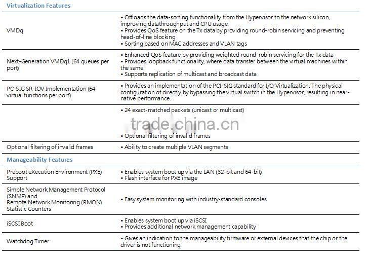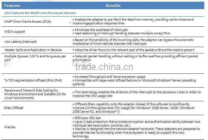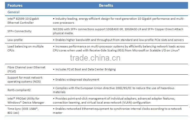 The Ethernet Converged Network Adapter NIC20G with SFP+ connectivity, is a very flexible and scalable Ethernet adapter for today's demanding data center environments. Data center networks are being pushed to their limits. The escalating deployments of serverswith multi-core processors and demanding applications such as High Performance Computing (HPC), database clusters, and video-on demand are driving the need for 10Gbps connections. Customers require flexible and scalable I/O solutions to meet the rigorous requirements of running mission-critical applications in virtualized and unified storage environments. Powered by Intel’s third-generation 10GbE network controller, the Intel®Ethernet 82599 10 Gigabit Ethernet Controller, the NIC20 adapter addresses the demanding needs of the next generation data center by providing unmatched features for virtualization, flexibility for LAN and SAN networking, and proven, reliable performance.