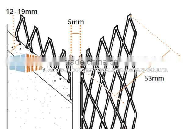 An expanded flange corner bead galvanized expanded metal meshwith extra long expanded flange. It has a steel rib running the length of the bead to provide nail holes and extra rigidity. Expanded Metal is a mesh formed from a single piece sheet metal. The sheet of solid metal is slit and stretched with each stroke of a die which forms a raised diamond pattern. The pattern changes by gauge and type of material and the size of the diamond. The mesh can be pressure rolled at so that the strands are in the same plane as the sheet.