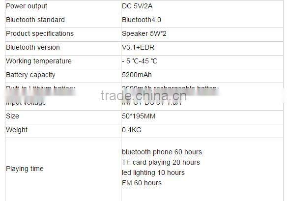 Main functions are:built-in bluetooth system for answering mobile phone,playing cellphone music,TF card music playing, FM radio,double alarm bells,audio input,mobile power supply,LED lighting.5200 mah long time lithium battery supply.
