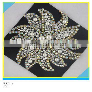 Hotfix Flower Shape White Pearl Applique AB Crystal Rhinestone Cup Chain Patch 10x10cm