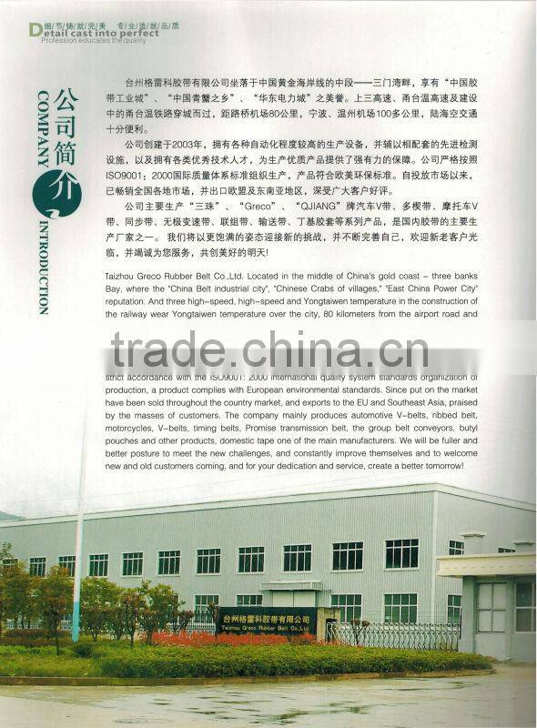 we are a good and reliable manufacturer in China, we have 3 factories with proven technique to produce all kinds of Rubber Timing Belt, PU Timing Belt, Wrapped V- belt, Cogged V-belt, Double Sided Timing Belt, Industrial Variable Speed Belt, Motorcycle V-belt, Ribbed Belt, Conveyor Belt, Planner Belt, Crawler Belt. PLease contact us if you are interested in these belts, OE and Part # is welcome!