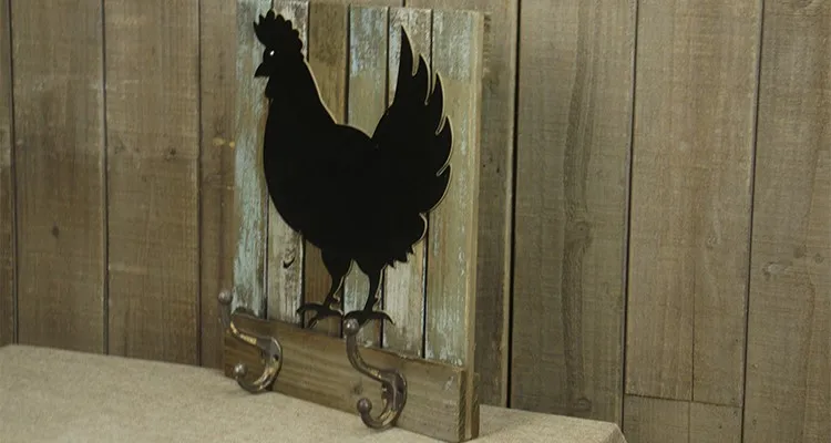 Animal Black Rooster Zodiac Antique Decorative Slat Wood Wall Plaque With Hooks