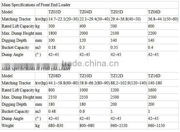 TZ Series Front End Loader for tractor is widely used in farm, grazing land, construction etc, mainly in shoveling, stacking or short-distance transporting of loose material like mud, sand and stone, garbage