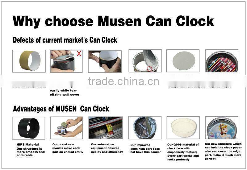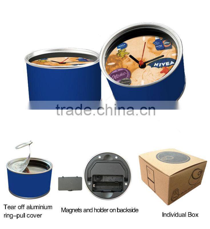 This is a cute can clock, named Magnet Can clock 2.0. Sealed with a aluminium ring pull cover, people don't know exactly what inside until they tear off ring-pull cover. It's four magnets on backside, which make it possible for refrigerator or metal message boards. Also it can be place on table for sure. Customized services are available. What kind of designs or printings, Promotional, Valentine, Wedding, Festivals, Tourism, normal gifts? You decide!