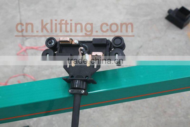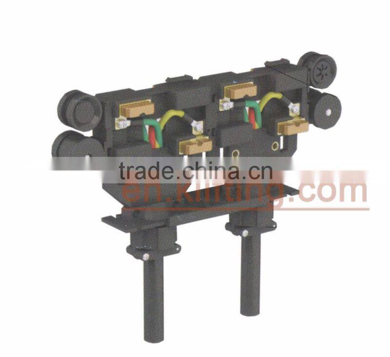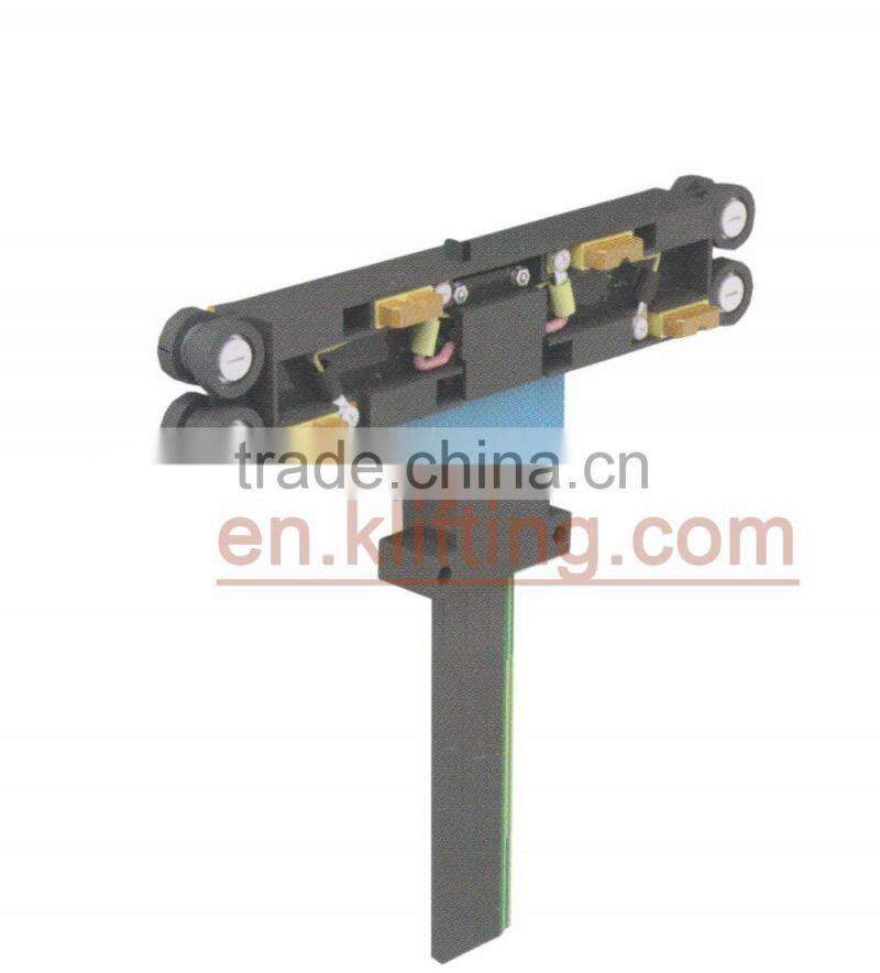 The current collrctor are made of carbon brush.reinforced nylon and gavanized or spray-paint meterial.Spring loaded carbon brushes maintain uniform contact.Connecting cables and hinged or flexible towing arms included.Double Current collectors for transfer applications and higher amperage are available.