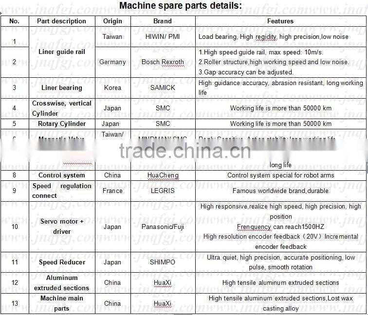 Full servo horizontal large series manipulator arm used for 400--4000 tons of various plastic injection molding machine,AC servo drive for 5 axis.Finished product arm to take out the product and runner,up and down the arm struture is double cut type;Takeout time of 1.5 sec,the cycle time of all 12 sec,the biggest load of 100 kg(including finished products ang fixture).Applied to quickly remove or out a variety of applications,especially the long shape prooducts such as car bumpers,door trim and insert the embedded applications.