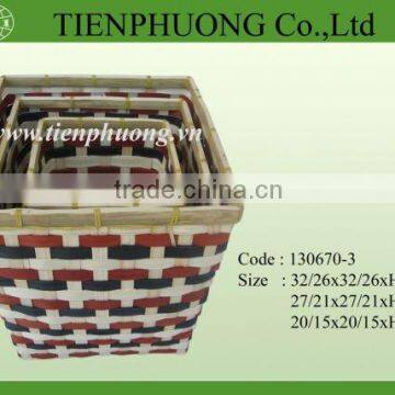 bamboo bin/ storage bins box is suitable for office or house storage.We specialize in the manufacture and export weaving bamboo products especially basketry which are made of bamboo, we focus on bamboo basket because its abundant renewable material and have more hard and touch properties, Some collections are very clever combination of various materals like rattan, sea grass, wooden, willow, fern, wicker, water hyacinth, ... we first split bamboo into slats and then further cut into small strip into Herringbone, expanding rectangles, step pattern and round, oval, square, flared shaped sides shape.Various pattern basket or Ornaments and decorative basket.