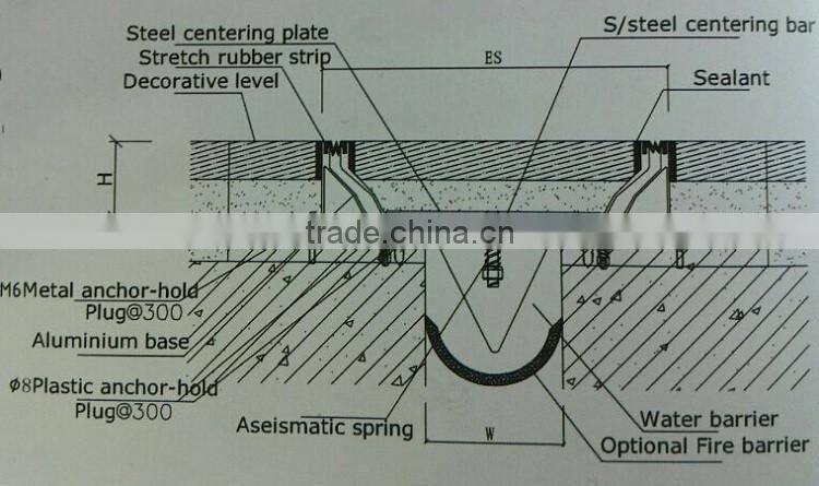 ADSZJ consists of two symmetrical aluminum bases covering with a steel(or galvanized steel) center plate. There is a stainless steel center bar connecting aluminum bases with a seismic spring in the middle position. ADSZJ is constructed with two rubber caulking strips at each side of exposed surface, coordinating perfectly with the decorative level of the application floor.