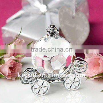 Each measures 1.5" x 1.5" and features a stunning multifaceted clear crystal pumpkin coach majestically perched on silver metal wheels and carriage. Sure to enchant your guests long before the clock strikes midnight, these favors make for a stunning presentation inside a Choice Crystal signature silver box decorated with white hearts, wrapped with a white organza and satin bow with a crystal heart accent on top and an attached heart shaped, matching design "For You" tag.