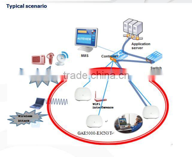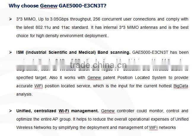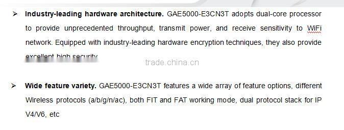 1. GAE5000-E3CN3T is an indoor, wall-mounted, 3*3 MIMO triple-radio (2.4GHz, 5.8GHz and optional to 2.4G or 5.8G radio), imbedded antenna, high-performance, enterprise-class WiFi AP, complying with 11ac standard, and is capable of delivering up to 3.05Gbps Data Rate
