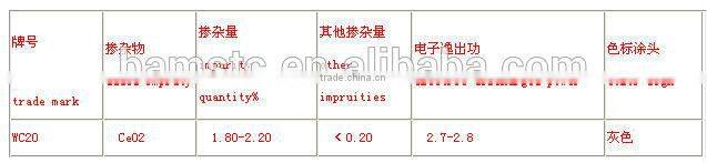 Cerium-Tungsten Electrode have good starting arc performance under the condition of low current. The arc current is low, therefore the electrodes can be used for welding of pipe, stainless and fine parts. Cerium-Tungsten is the first choice for replacing Thoriated Tungsten under the condition of low DC. BTMMF has several patents for WC electrodes production. (Patent NO:ZL89107270.5)