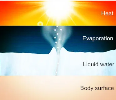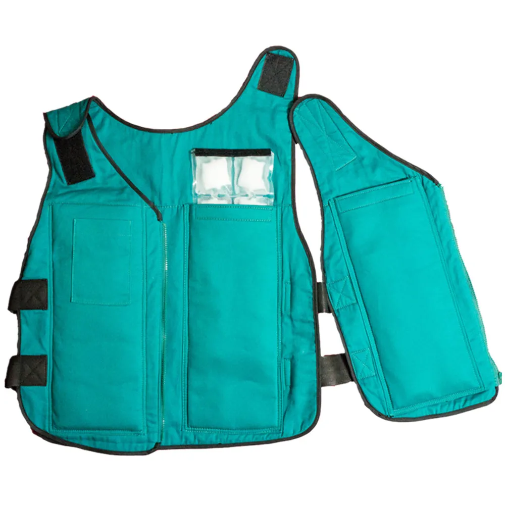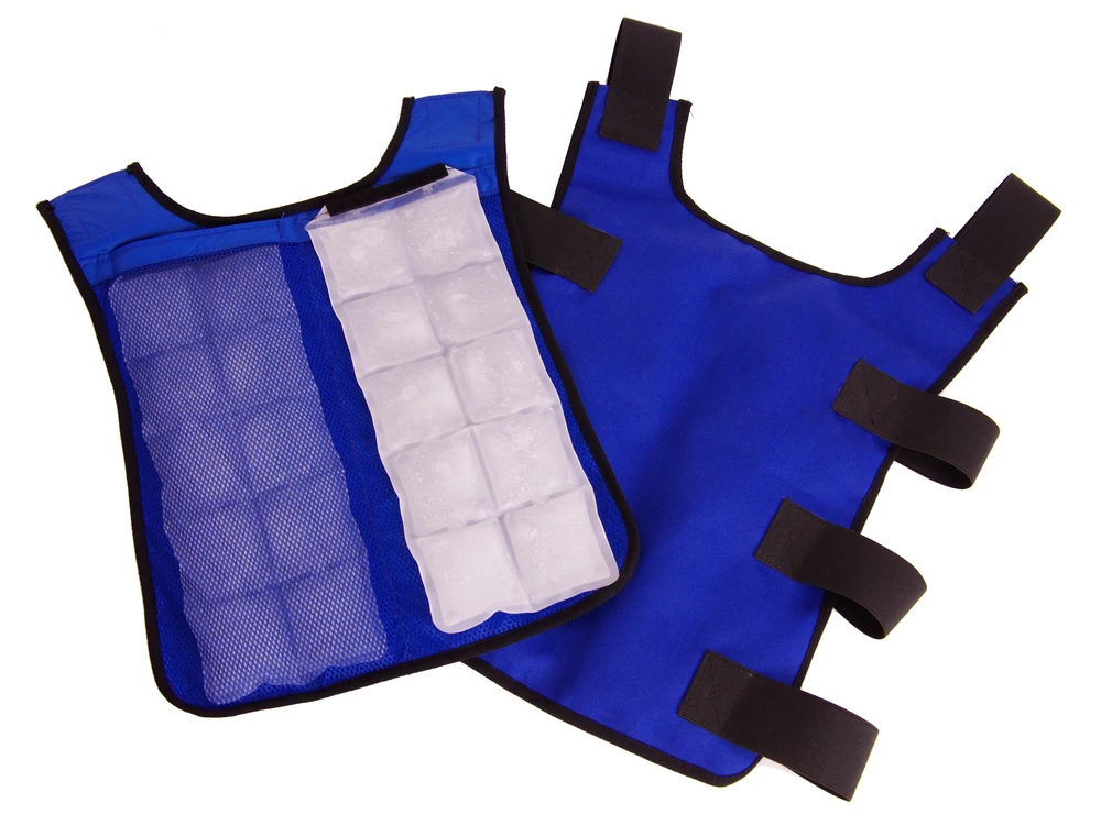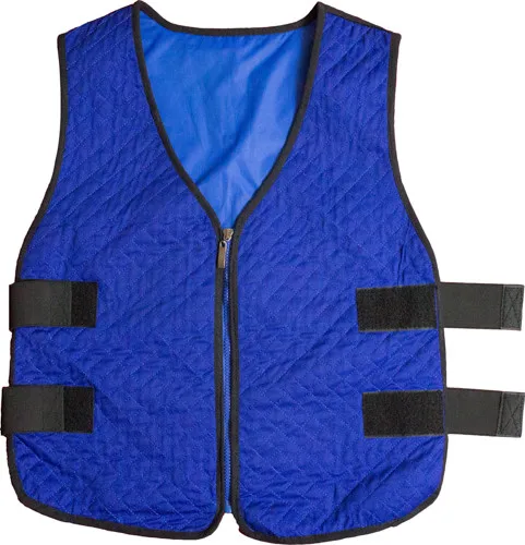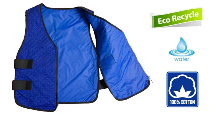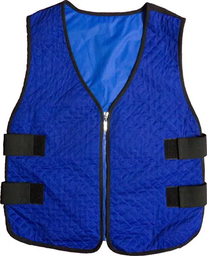 Evaporative cooling vests are typically submerge in water for 1 – 2 minutes and gently squeeze out any excess water. They are usually worn outside the clothing and as the water in the vest interacts with specially treated cooling crystals or other cooling agents and the water evaporates, body temperature is effectively reduced.