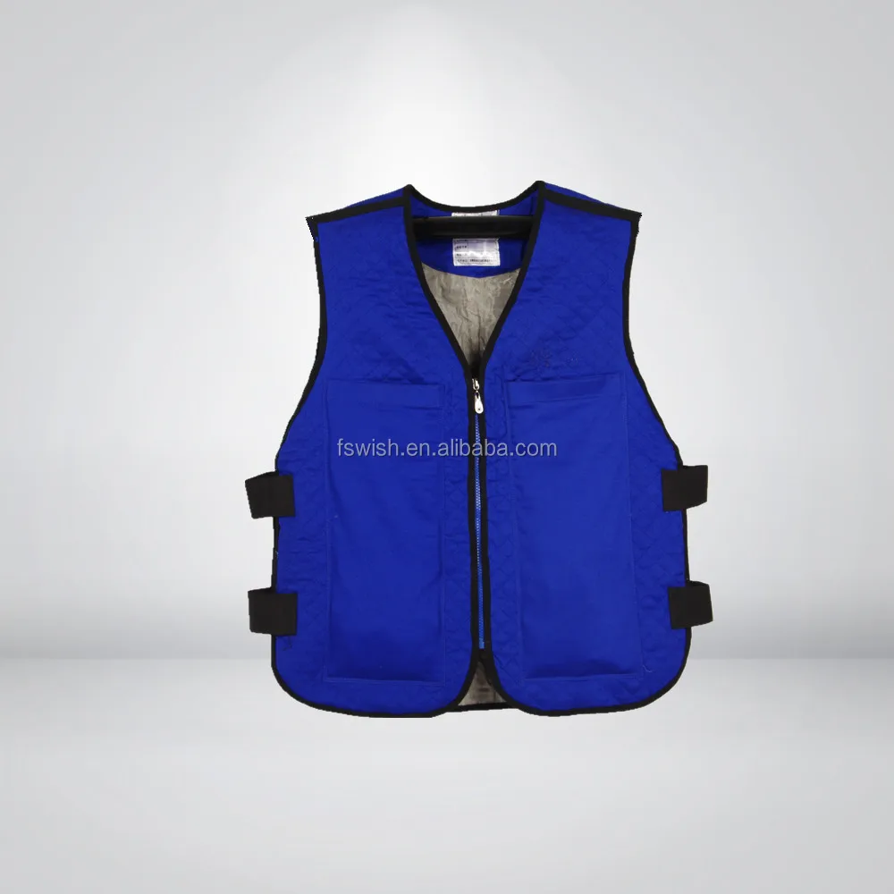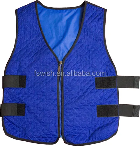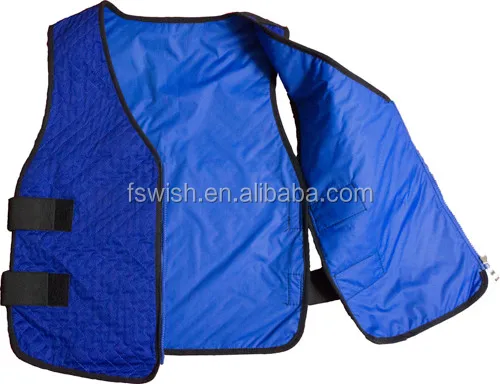 Evaporative cooling vests are typically submerge in water for 1 – 2 minutes and gently squeeze out any excess water. They are usually worn outside the clothing and as the water in the vest interacts with specially treated cooling crystals or other cooling agents and the water evaporates, body temperature is effectively reduced.