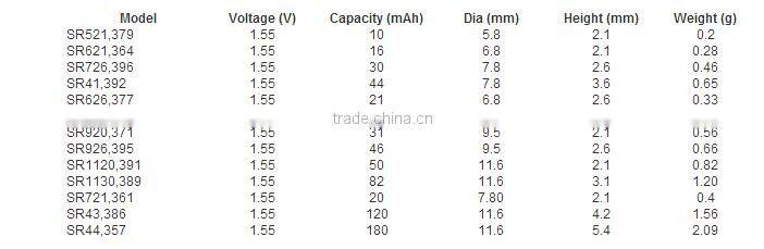 Silver Oxide battery whole series as: SR521, SR621, SR736, SR41, SR626, SR48, SR920, SR926, SR1120, SR936, SR1130, SR721, SR43, SR44.