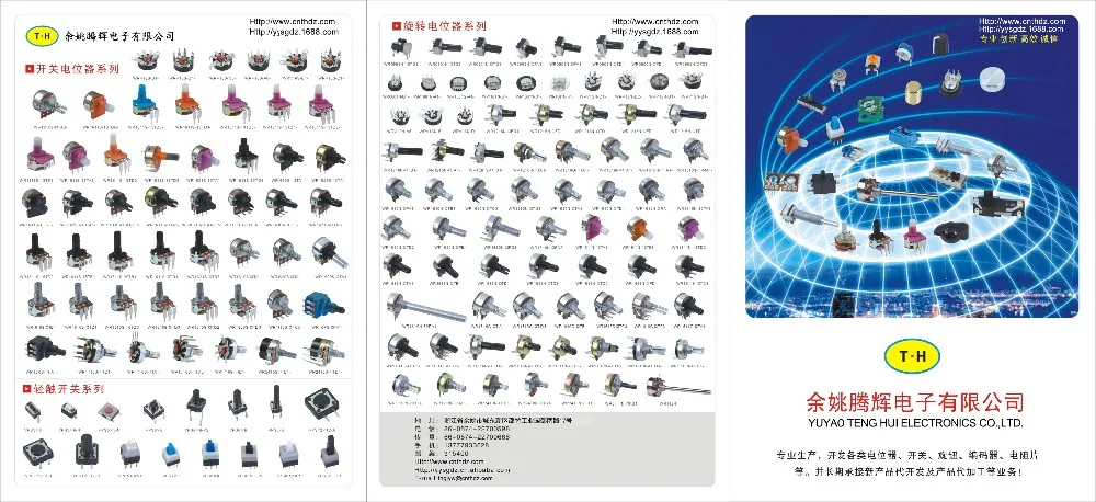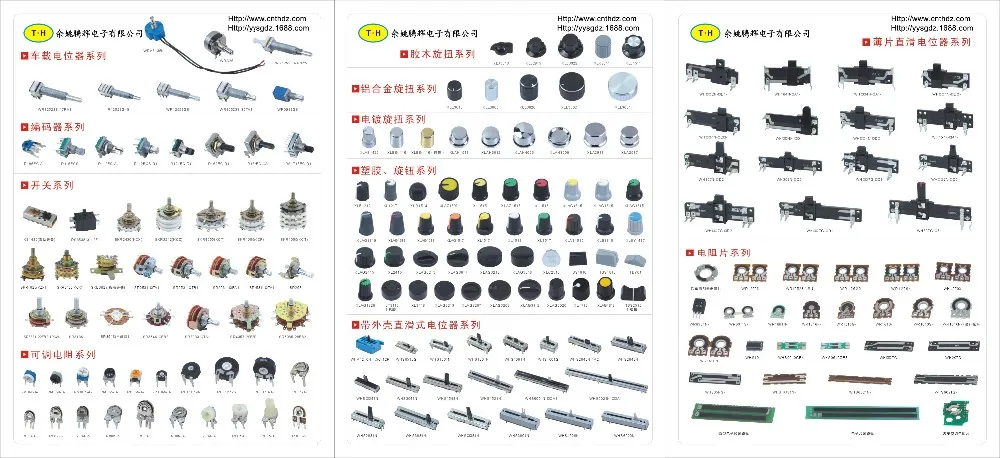 Yuyao teng Hui Electronics Co., Ltd. is a professional development and design of metal molds, plastic mold , die casting mold set production and development of integrated enterprise , specializing in producing all kinds of potentiometer, potentiometer knobs, switches , encoders, resistors , variable resistors manufacturing providers complete product specifications , quality assurance , timely delivery , good service , short development cycle . Our products are widely used in various household appliances , automotive electronics, sensors, medical equipment , teaching equipment, tuning speed dimming , instrumentation , electronic toys , games and communications equipment and other products.