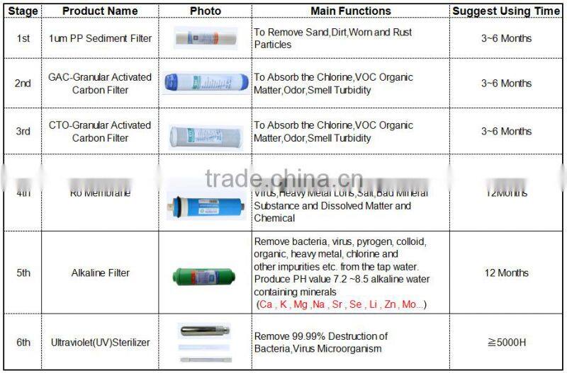 6 Stage Filters PP+GAC+CTO+RO+ Alkaline Filter +UV light