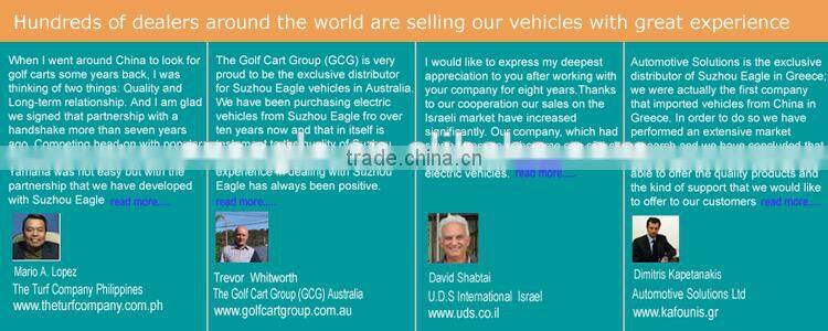 Suzhou Eagle has passed and got the certificates of ISO9001-2008 for quality management system and ISO14001-2004 for environmental management system.This golf cart has pass CE (EMC) test.
