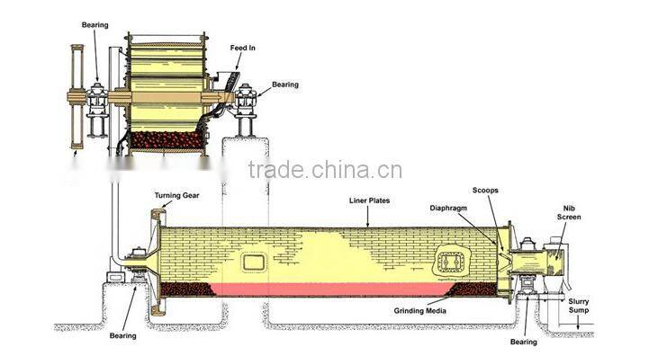 When the cylinder of the grinding mill rotates driven by the transmission gear, under the inertial centrifugal force, the grinding media will stick onto the lining board on the internal wall of the cylinder of the grinding mill and rotate together with the cylinder. The grinding media are brought to a certain height, and then fall down under the gravity, and during this process, the grinding media will crush the materials inside the cylinder, and at the same time the grinding media repeatedly move up and down inside the rotating grinding mill and will have sliding and rolling movement, so that the grinding media, the lining board and the materials to be ground will grind with each other, so that the materials are crushed to a finer granularity.