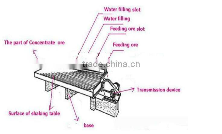 Shake table is on the lean table board with raffles. The ore material is fed in by the feeding chute upper table board; meanwhile, the water is fed by water feeder transversely. Under the impact of vibrating wave, the materials go on vertical and horizontal movement as per the different proportion and granularity. The ore material with different proportion and granularity move down in laddershipped state along with their own movement, then discharge from the fine concentrate end and tailings end, finally they are separated out to fine concentrate, middle concentrate and tailings.