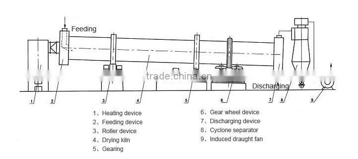 The heat source of the drum dryer comes from the combustion device and this dryer uses co-current heating method, so that when the materials to be dried go into the cylinder from the feeding box or feeding chute, they are pushed back by the spiral lifting board. Since the drum dryer is obliquely installed, the materials flow to the lower end of the machine under the gravity and the rotation of the machine, and on the other hand, the materials are repeatedly lifted by the lifting board to the higher end and then spread down constantly, so that the materials will form a even curtain inside the cylinder and conduct heat exchange with the hot air inside the cylinder. Since the materials constantly spread and the water contained in them will be dried, thus achieving the aim of drying.