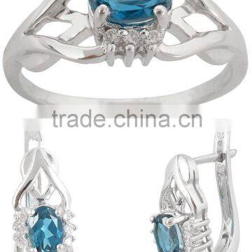 925 Sterling Silver Ring-Earring Set With  Natural London Blue Topaz & Cubic Zircon Stones.